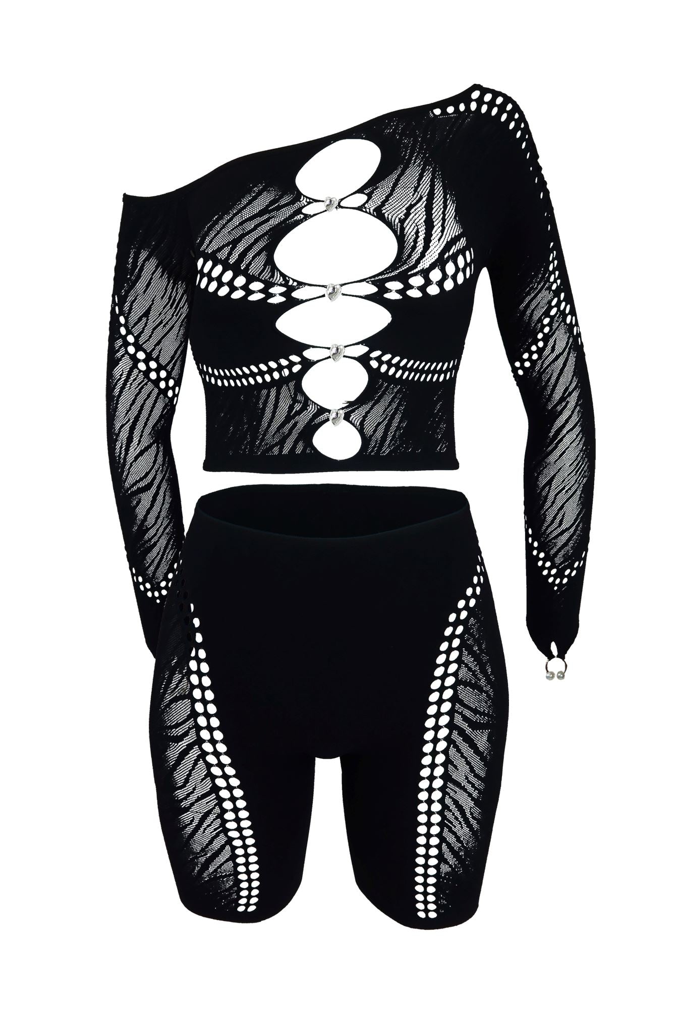 Long sleeve off shoulder crop top featuring rhinestone buttons and gold pearl rings